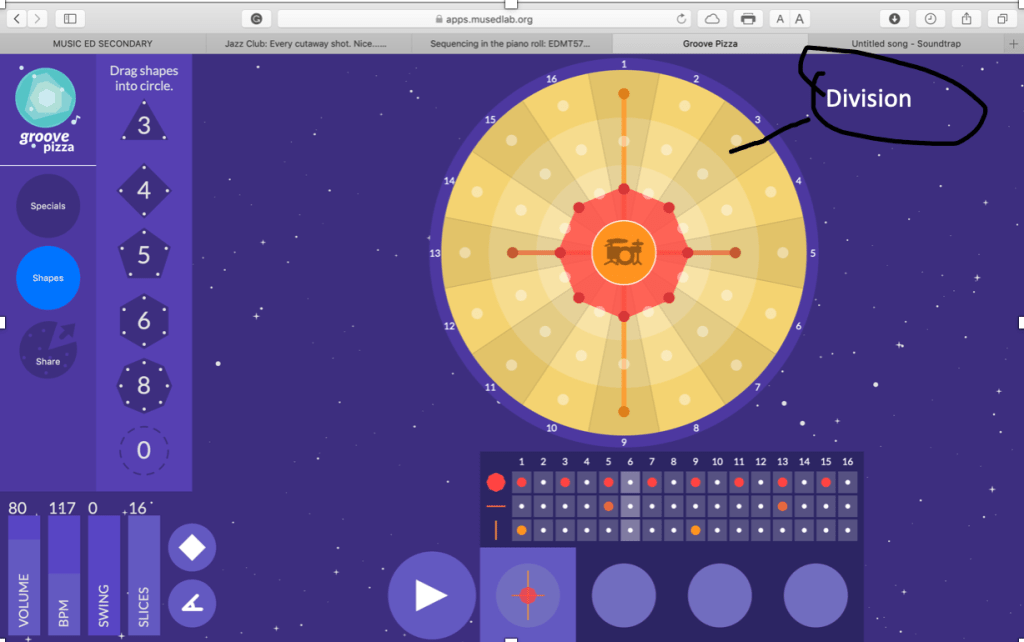 The “pizza slices” are divisions and the numbers around are “bars”. Users can drag the dots to different spots to create shapes (rhythms) There’re several things we can play with in the bottom left corner-volume, BPM, swing and number of slices.