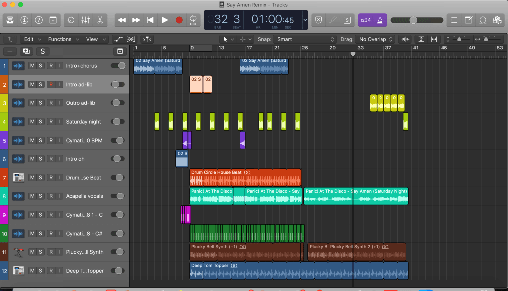 Once again, I worked on LogicPro X. Assigned a colour to each track to make them nice and clear, 12 layers in total. All loops and samples.
