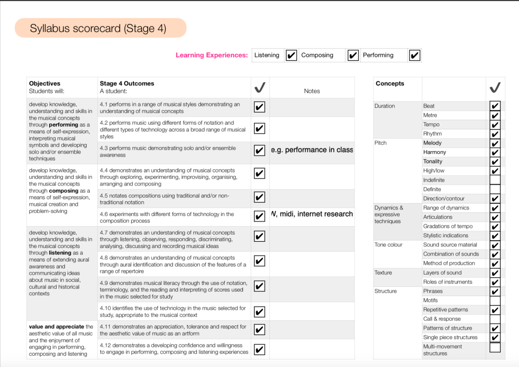 This task would be good training for timing and listening skills because they have to follow the metronome and check whether the loops are in time. Sense of rhythm is very important for musicians. Let’s say I give this task to a stage 4 class, it would tick most boxes in the checklist below-